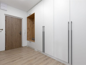 V předsíni je vybudovaná nová prostorná šatní skříň na míru v kombinaci bílé barvy a dekoru dřeva.