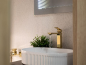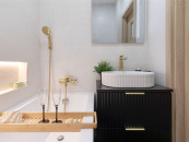 Zděná koupelna s obklady a dlažbou, které k sobě ladí, nová sanita, designová skříňka s umyvadlem a moderním zrcadlem s osvícením.