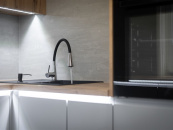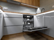 V kuchyni je kuchyňská linka na míru ve tvaru U v kombinaci šedého lesku a dekoru dřeva s vestavěnými spotřebiči lednice s mrazákem, plně integrovaná myčka, mikrovlnná trouba, elektrická trouba, indukce, digestoř a granitový dřez.