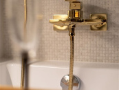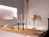 Zděná koupelna s obklady a dlažbou, které k sobě ladí, nová sanita, designová skříňka s umyvadlem a moderním zrcadlem s osvícením.