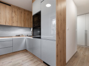 V kuchyni je kuchyňská linka na míru ve tvaru U v kombinaci šedého lesku a dekoru dřeva s vestavěnými spotřebiči lednice s mrazákem, plně integrovaná myčka, mikrovlnná trouba, elektrická trouba, indukce, digestoř a granitový dřez.