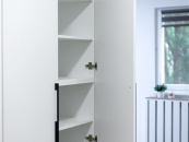 V předsíni je vybudovaná nová prostorná šatní skříň na míru v kombinaci bílé barvy a dekoru dřeva.