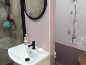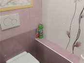 Koupelna je zděná včetně obkladů a dlažby, které k sobě ladí. Nová sanita sprchový kout a závěsné wc.