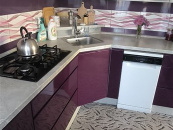 V kuchyni je rohová kuchyňská linka v kombinaci bílého lesku s fialovou barvou včetně vestavěných spotřebičů.