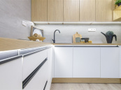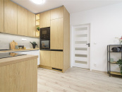 Byt disponuje obytnou kuchyní o vel. 14 m2 s novou kuchyňskou linkou do tvaru U v kombinaci bílé barvy a dekoru dřeva s vestavěnými spotřebiči lednice s mrazákem, myčka, varná deska, elektrická a mikrovlnná trouba. Kuchyňskou linku ocení zejména hospodyňky díky velké pracovní ploše a úložnému prostoru.
