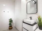 Koupelna včetně obkladů a dlažby, které k sobě ladí, nová sanita a koupelnová skříňka na míru s úložným prostorem a prostorem na umístění pračky.