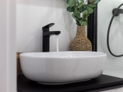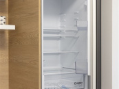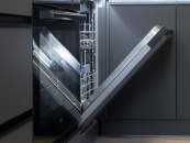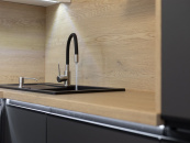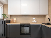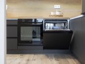 V kuchyni je nová rohová kuchyňská linka na míru v kombinaci antracitu a bílé barvy s vestavěnými spotřebiči lednice s mrazákem, horkovzdušná trouba, indukční varná deska, myčka, digestoř.